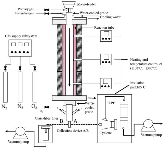 WS, SS, and their blends were burned in a high-temperature drop tube furnace (DTF), as shown schematically in Figure 1. The DTF system is composed of a micro-feeder, a gas supply subsystem, a reaction tube and its heating furnace, and a sampling subsystem. The key component of the DTF is a corundum tube with a length of 1600 mm and an inner diameter of 48 mm. The tube is heated by three-section electric heating elements (450 mm each). The tube wall temperatures are measured by three thermocouples at the midpoint of each section and monitored for controlling the heating to achieve an isothermal length of approximately 1200 mm. During the experiment, fuel particles were delivered by the micro-feeder, carried by primary air and further mixed with secondary air, and then entered the reaction tube to undergo combustion through a water-cooled probe inserted in the top of the DTF tube. The products including the flue gas and ash particles were extracted at the bottom of the reaction tube by a nitrogen-quenched, water-cooled sampling probe, and then directed to a glass-fiber filter (sampling line B in Figure 1) to collect bulk ash particles or sampling line A to sample fine particulate matter (PM). Sampling line A consists of a cyclone with an aerodynamic cut-off size of 10 μm to remove larger particles and a 14-stage electric low pressure impactor (ELPI) (ELPI+, Dekati, Finland) to size-segregate fine PM and measure the particle concentrations and particle size distribution (PSD) of the fine PM in real time. Both sampling lines were kept at 105 °C to avoid the impact of the possible condensation of acid gases and moisture in the flue gas on the sampling and measurement of solid particles [31]. The collected bulk ash particles by the filter or fine PM samples by ELPI stages were subjected to the subsequent characterization.