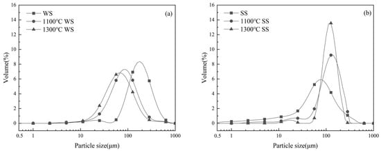 PSDs of (a) WS and (b) SS and their residual ashes from the combustion at 1100 °C and 1300 °C.