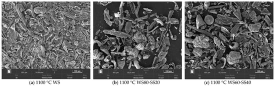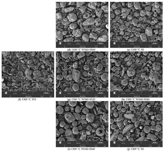 SEM images (300×) of residual ash particles from the combustion of WS, SS, and their blends at (a–e) 1100 °C and (f–j) 1300 °C.