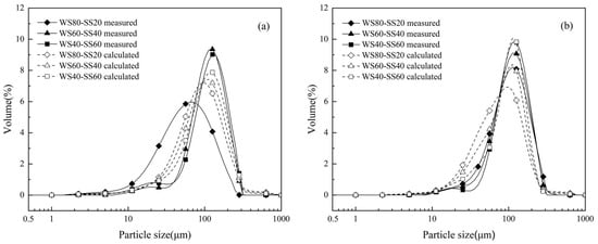 Measured and additively calculated PSDs of the bulk ashes from the combustion of three blends of WS and SS at (a) 1100 °C and (b) 1300 °C.