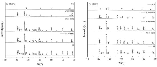 As can be seen in Figure 5, the crystalline phase in the 1100 °C WS ash is solely sylvite (KCl), while quartz (SiO2) is also detected in the 1300 °C WS ash. These are expected because K, Cl, and Si are the dominant elements in WS ash (Table 2). During combustion, KCl occurs or is formed in ash, while SiO2 in the WS is transformed into the crystalline phase, quartz, at higher temperatures [34]. In the 1100 °C SS ash, the minerals detected primarily included quartz, AlPO4, and K- and Ca-aluminosilicates, consistent with the high contents of Si, Al, P, and Ca in SS (Table 2), as well as minor species of Ca-Fe-Mg silicates, hematite, and CaSO4. In the 1300 °C SS ash, the minor minerals and some aluminosilicates disappear and probably transform into the glass phase, indicated by ash particles melting at the higher temperature (Figure 3).
