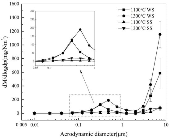 Figure 6 illustrates the ELPI-measured, mass concentration-based PSDs of the PM10 produced from burning WS and SS at two temperatures. Clearly, the PSDs all display a bimodal pattern, with a submicron mode located between 0.3 and 0.5 μm and a supermicron mode of particles larger than 2 μm, typical of PM10 generated from pulverized biomass combustion [37,38]. The productions of both submicron and supermicron particles from WS combustion are much higher than those from SS combustion. Increasing the combustion temperature from 1100 °C to 1300 °C increases the formation of submicron particles and leads to the shift of the mode diameter from 0.31 to 0.48 μm for WS and SS combustion. The reason is that higher temperature promotes the vaporization of inorganic matter during combustion [16], resulting in subsequently forming more PM1 and enhancing the growth of submicron particles by coagulation and condensation. Elevating the temperature also considerably increases the yield of supermicron particles from WS combustion.