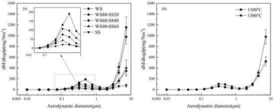 Mass concentration-based PSDs of PM10 produced from (a) burning the three blends and parent fuels at 1300 °C and (b) burning WS80-SS20 at 1100 °C and 1300 °C.