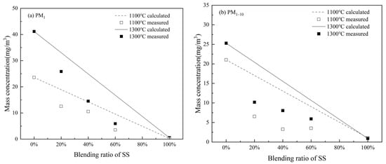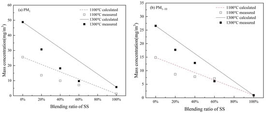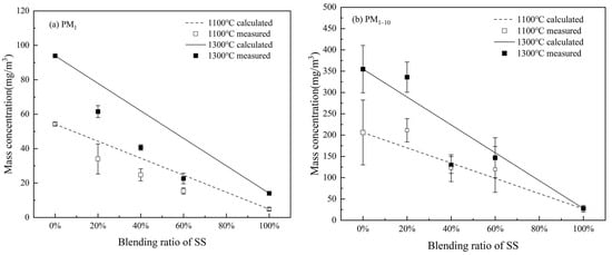 Cumulative concentrations of (a) PM1 and (b) PM1–10 generated from the combustion at 1100 °C and 1300 °C, varying with the blending ratio of SS with WS.