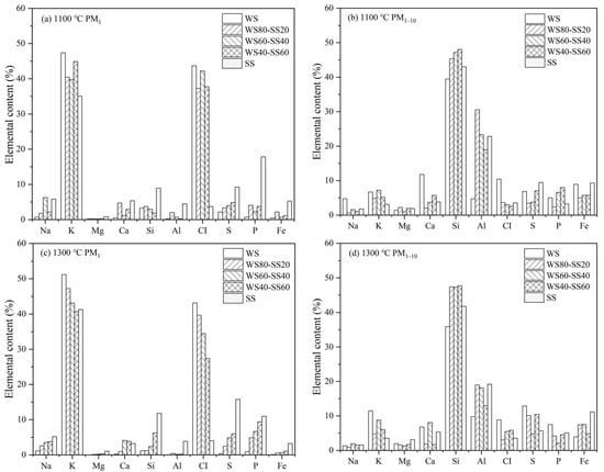Elemental compositions of PM1 and PM1–10 from the combustion of WS, SS, and their blends: (a) 1100 °C PM1, (b) 1100 °C PM1–10, (c) 1300 °C PM1, and (d) 1300 °C PM1–10.