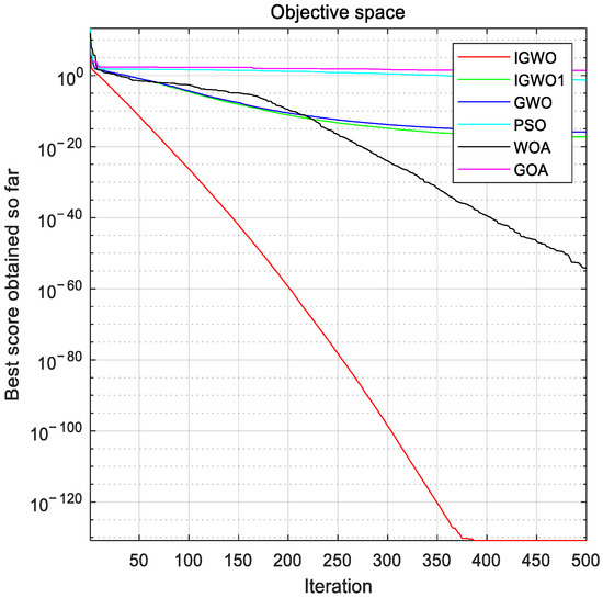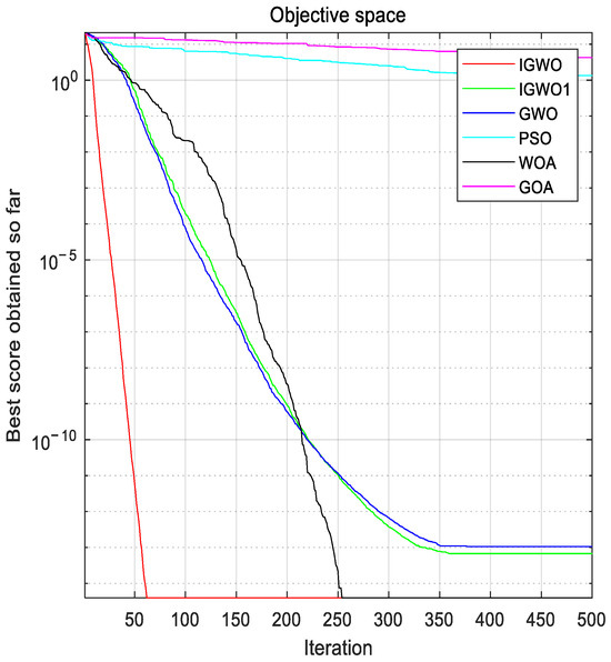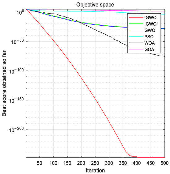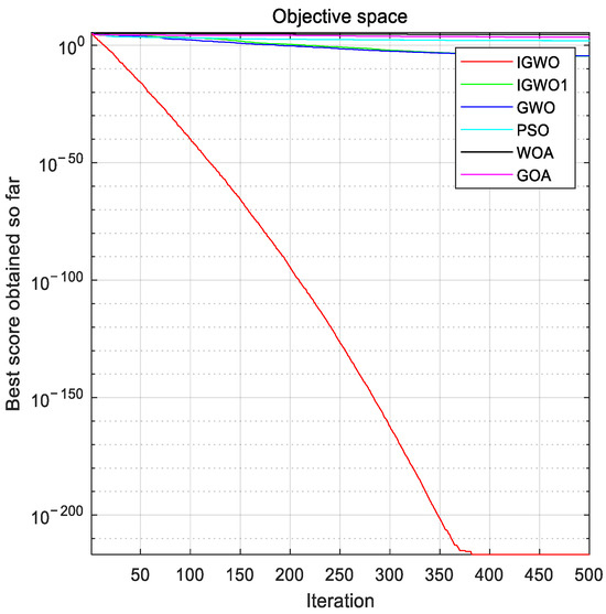 In Figure 4, Figure 5, Figure 6, Figure 7, Figure 8, Figure 9, Figure 10 and Figure 11, iterative convergence curves are plotted for eight typical functions representing the full range of features from F1 to F8. It can be seen that the convergence curves of the IGWO show a strong exploration and exploitation capability overall compared to other algorithms. In the F1, F2, F3, F6, and F8 test plots, it can be seen that the convergence curves of the algorithm change more drastically, which indicates that the improved parameters A and C and the updated Formula (19) provide better solutions for the algorithm and speed up the convergence of the algorithm when dealing with single-mode and multi-mode problems. In the F4, F5, and F7 test plots, it can be seen that the convergence curve of the algorithm has an obvious turn in the iterative process, which indicates that the enhanced population diversity of the improved algorithm makes the convergence accuracy of the algorithm show a significant improvement compared with most other algorithms when dealing with single-mode and multi-mode problems, further verifying the detection capability of the IGWO. From the overall test results, it is clear that the first half of the improved algorithm’s curve has completed convergence and that the convergence accuracy is closer to the optimal value, illustrating the important role of the proposed algorithm-improvement mechanism in the global search. In addition, compared with other algorithms, the IGWO had a faster convergence speed and maintained a better convergence accuracy, thus verifying the effectiveness of the improved gray wolf algorithm.