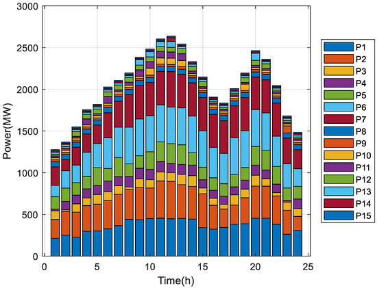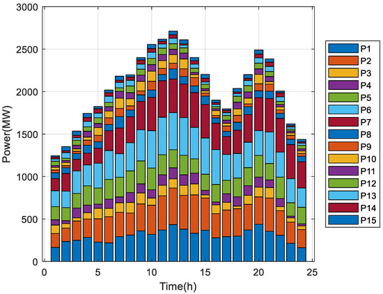 In order to verify the reliability of the algorithm and constraint treatment proposed in this paper in solving the economic dispatch problem, three cases of different sizes of the single-objective dynamic economic dispatch model were considered, namely Case 1: 5 generating units; Case 2: 10 generating units; and Case 3: 15 generating units [41]. The scheduling period was T = 24 h and the valve point effect and transmission loss constraints were considered for each case, with the corresponding B-factors taken from the studies of Qian and Mohammadi et al. [41,42]. The maximum number of evaluations of the algorithm was D × 10,000, with D representing the dimensionality of the decision variables; in addition, the maximum allowable error at each moment in the process of repairing infeasible solutions was 0.001, and to avoid chance, each case was run 30 times independently. The experiments were simulated in MATLAB software.