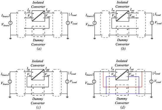 PPC configurations: (a) Isolated converter’s output connected in series with the dummy converter’s output to produce IPOS topology. (b) Series connection between the input of the isolated converter and the input of the dummy converter to produce ISOP topology. (c) Series connections for both sides of the isolated and dummy converters giving rise to ISOS topology. (d) IPOP diagram showing source connected in parallel to the load, which will be analyzed further in Section 3.7.