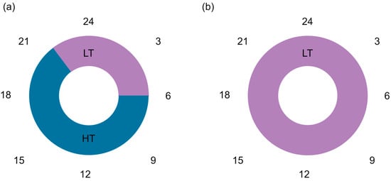 Understanding the electric energy cost can help active users to make informed decisions about their energy consumption and to optimize their energy use to reduce costs. Electric energy costs consist of the following: the market price of electric energy, the network charge (transmission network charge and distribution network charge), contributions (a contribution for a market operator (C1), a contribution for energy efficiency (C2), a contribution to support the production of electric energy from renewable energy sources (RES), and high-efficiency co/generations (C3)), and the excise duties on electric energy (C4). The network charge represents the amount that an active user of the transmission system must pay for utilizing the system. Its purpose is to cover the costs incurred by the electricity system operators in each year of the regulatory period. The Energy Agency establishes the network charge for the electricity system in accordance with the Legal Act on the methodology for determining the regulatory framework for electricity system operators. The prices set by the Energy Agency for contributions and charges, which were valid in 2022, were used. In Slovenia, there is a two-rate tariff system, which is shown Figure 1. The low tariff (LT) is applied during off-peak hours, which last from 00:00 to 5:59 and from 22:00 to 23:59. The LT is also used on holidays and weekends. The high tariff (HT) is applied during peak hours, which last from 6:00 to 21:59.