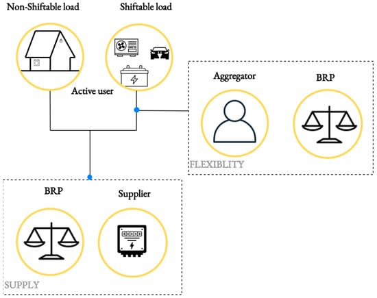 Household consumers and active users are becoming more equipped (PV plants and advanced metering) and have the potential to provide new services of flexibility. Flexibility is described as a movement in the active user’s load profile caused by changes in the load profile. Although the flexibility potential of household active users is limited, an effective grouping of active users may be sufficient to keep the power system balanced. A new role—the aggregator—is required in the energy value chain for the consumers and prosumers to have access to this flexibility market. The aggregator connects numerous modest flexibility resources into a usable flexibility volume by working between active suppliers and active users. With the participation of active users in the energy value chain, an understanding of new relationships, services, and programs will be required. Any legal or natural person who wishes to participate actively in the electric energy market will have to join the Balance Scheme. Balance Schemes and electric energy market operators are connected through a set of procedures, regulations, and market mechanisms that ensure an efficient and reliable supply of electric energy. This connection is critical for maintaining the balance between electric energy generation and consumption in the power grid. The electric energy market in Slovenia is organized hierarchically into a Balance Scheme, which is managed by the electric energy market operator, Borzen, and d.o.o.