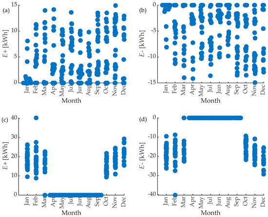 The flexibility potential of EVs is defined by the EV charging habits that are analyzed throughout the year. The flexibility potential of EVs is defined with (7), where is the electric energy consumption of the EV. The assumptions considered in defining the flexibility potential of the EV are as follows: the EV is charged every day and the EV is available every day after 16:00. The positive flexibility potential of the EV is defined by allowing the reduction and rescheduling of EV charging during charging periods, and changing the positive flexibility potential on an annual basis, as can be seen in Figure 4a. The negative flexibility potential of the EV includes identifying instances when the EV has not yet been fully charged within the day, and if it is past 16:00, the charging can be rescheduled. The negative flexibility potential of the EV throughout the year can be seen in Figure 4b.