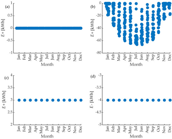 The flexibility potential of the PV is defined with (9), where is the electric energy produced from the PV and is the consumption of the load. The negative flexibility potential of the PV size is defined as the difference between the energy produced from the PV and the consumed energy, and can be seen in Figure 5a. The positive flexibility potential of the PV is defined as zero, because PV plant systems are dependent on solar irradiance, which cannot be controlled by an active user, and can be seen in Figure 5b. The amount of produced energy from the PV plant is determined primarily by the environmental conditions.