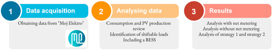 The case study involved an active user in a single house with an installed PV plant of 11 kW. The house was equipped with an HP for central heating and a charging station for an EV. The research process consisted of several critical stages, as shown in Figure 9, starting with data acquisition. Information on electric energy consumption and energy produced from the PV plant in the 15 min interval was obtained on the “Moj elektro” platform. The data from the platform were exported in Excel and processed further in Matlab. The next step was data analysis, focusing on the consumption and production patterns. Following that, the identification of shiftable loads was conducted, and, additionally, a BESS was included. Important data-driven results were derived as a result of this comprehensive analysis. The results were divided into the following 3 categories: the analysis with net metering, the analysis without net metering, and the analysis to evaluate the advantages of a collaboration between an active user and an aggregator, where two strategies were tested.