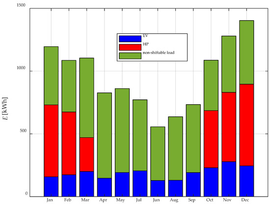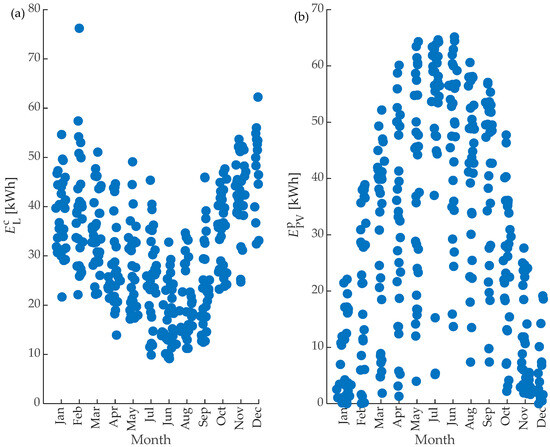 Daily load consumption (a) and PV production distributed (b) by month.