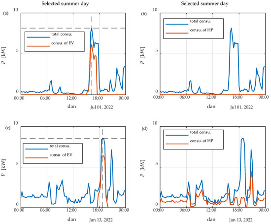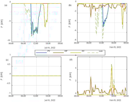 The flexibility potential of the HP is defined by (8), where is the electric energy consumption of the HP. The negative flexibility potential of the HP on an annual basis can be seen in Figure 4b, while the positive flexibility potential of the HP on an annual basis can be seen in Figure 4d. The fHP weighting factor is a parameter that typically ranges between 0 and 1, determining the degree to which we want to adjust the power of the HP.