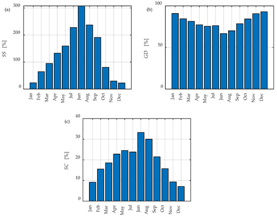 The self-sufficiency (SS), self-consumption (SC), the grid-dependency (GD) indicators are calculated and can be used to assess the level of energy independence of a system. The SS indicator is used to estimate how much energy a PV plant can provide for its own needs without relying on external resources. The SS indicator describes the relationship between the energy produced from the PV plant for the observed time period and the total consumption of the household for an observed time period, and can be calculated using (3). The observed time period (T) can be a day, a month, a year, or any period of time.
