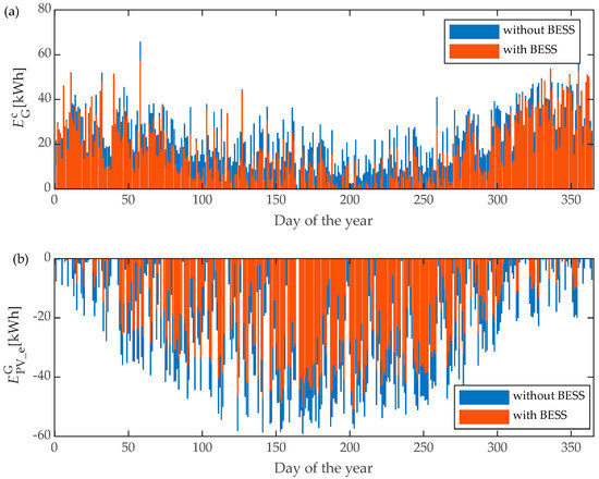 When the BESS is included in the household, the SC indicator is used to estimate how much electric energy is generated from the PV plant, and the BESS is actually used in a 15 min time interval. Equation (5) is used to calculate the SC indicator with the inclusion of the BESS in the household.