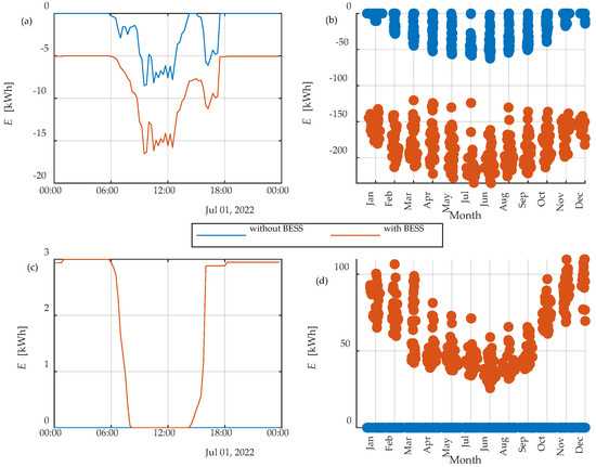 The flexibility potential of a BESS can be quantified based on its capacity to store and release energy at specific times, its efficiency in these processes, and its ability to respond to various grid events and signals. The operation and dynamics of the charging and discharging of the BESS are different for different strategies, which are described below. The flexibility potential of the BESS is defined by (10), where SOCmin and SOCmax are changing according to the strategy and different modes. The flexibility potential of the BESS is offered to an aggregator only in strategy 2. The negative flexibility potential of the BESS on an annual basis can be seen in Figure 5c, while the positive flexibility potential of the BESS on an annual basis can be seen in Figure 5d.
