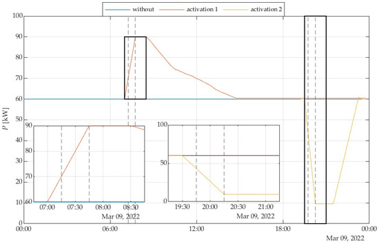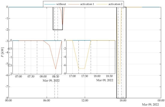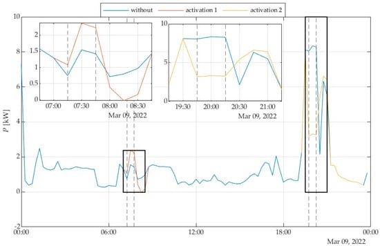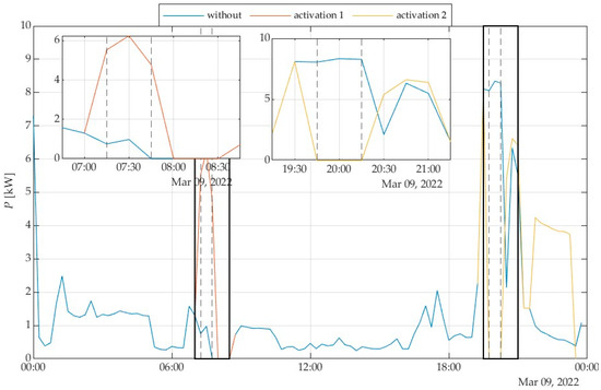 The consumption from the grid for the selected day during two responses to the aggregator signal is displayed in Figure 20. The changes during and after activation 1 are shown in Figure 20 in the box in the left corner. The change in consumption from the grid during the activation 1 was 3.34 kWh. The changes during and after activation 2 are shown in Figure 20 in the box in the middle. The change in consumption from the grid during the activation 2 was 6.17 kWh.