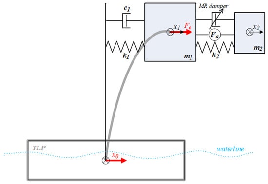 An NREL 5MW wind turbine (Table 1) tower-nacelle system, supported by a TLP [23] (Table 2), is regarded as a protected structure [26,27]. The NREL 5MW tower-nacelle system’s 1st bending mode corresponds to the dominant modal mass and vibration energy participation, especially for the low-frequency range associated with wave, wind and rotor excitations. Therefore, the current study takes into account the structure’s 1st bending mode modal parameters, such as mass m1, stiffness k1, and damping c1 (Table 3). Previous studies confirm minor discrepancies of the 1 DOF tower-nacelle model vs. FAST code responses to tower base horizontal excitations [5,28], being the case regarded in the current research. An H-MR-TVA of the absorber mass m2 and spring stiffness k2 embedded in the nacelle is considered (Figure 1) based on [28]. The movement of both m1 and m2 is assumed to be linear displacement x1 and x2, accordingly (small bending angles assumed), along the common, horizontal axis of an external force (representing the resultant load applied to the nacelle i.a. through rotor) and the supporting TLP platform surge motion (Figure 1). An MR damper and a small-scale electromagnetic actuator [21] of an output force are both built-in parallel to the spring k2 in the TVA system. The absorber stiffness k2 (and damping c2 for passive TVA tests) was tuned either to the NREL 5MW tower-nacelle 1st bending mode frequency of 0.30 Hz (from now on referred to as TVA-TN) or to the TLP surge frequency of 0.10 Hz (from now on referred to as TVA-TLP). For structural vibration control purposes, the MR damper was used, working in cooperation with the force actuator or independently.