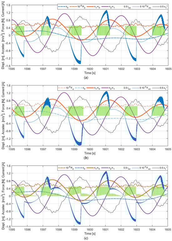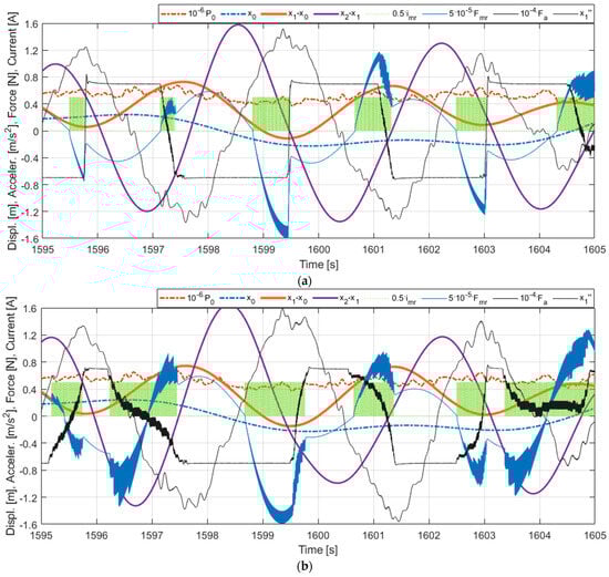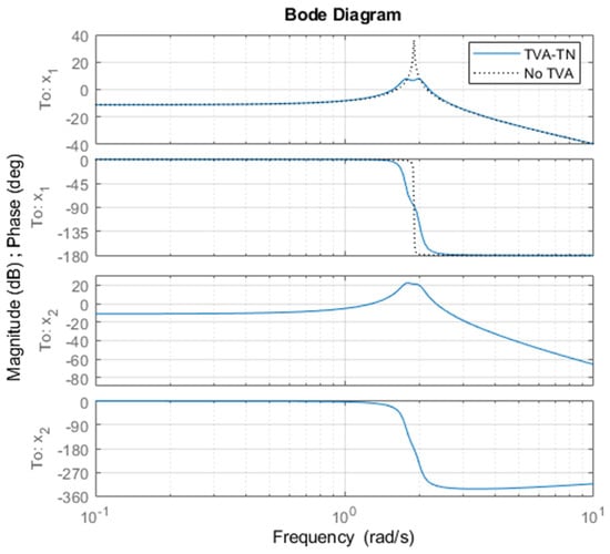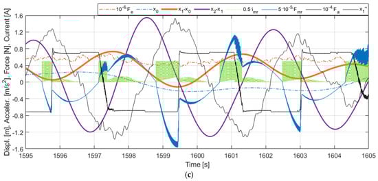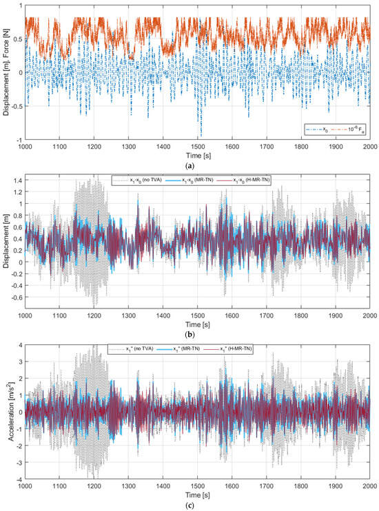 The newly introduced term implementation, the original contribution of current research, is intended to minimise the protected structure’s (i.e., nacelle/rotor with its sensitive instrumentation) acceleration. As the structure acceleration increases with the square of the frequency (for the constant oscillation displacement amplitude), this term is aimed to minimise predominantly higher frequency content of the displacement (thus minimising the acceleration ). At these higher frequencies TVA mass vibrates at a close antiphase to the protected structure’s mass—see x1 vs. x2 phase diagrams (Figure 2). Thus, the minimisation of the high-frequency content of with the use of appropriate weight consequently reduces moving away the protected structure and the TVA (due to the close antiphase). This, in turn, reduces the TVA stroke amplitude and MR damper force amplitude, which will be proven in Section 7.