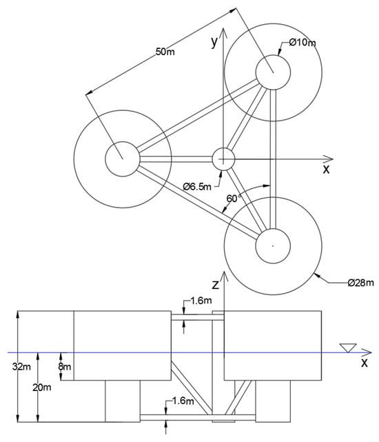 Regarding the type of support structure, the conventional mooring arrangement of the spars, barges, and semisubmersibles permits significant linear and angular motions of the platforms due to the inherent low stiffness of the catenary-type mooring legs. In this respect, the tension leg concept offers the most stable solution, minimising the heave, pitch, and roll motions by imposing large pretension mooring forces. In this way, the platform is moving by the wave action mainly in the surge, and the wind turbine dynamics are comparatively less affected. Fatigue damage equivalent loads are lowest for TLP-based wind turbines [23]. TLP FOWT concepts combined with wave energy devices of the oscillating water column (OWC) type have been experimentally investigated in [24,25]. The surge response of a TLP FOWT combined with OWCs was measured in [24] and formed the basis for the vibration mitigation examined in the current study.