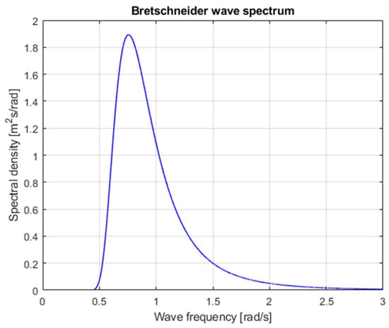 For the installation location considered in the Aegean Sea, the most probable severe wave state can be described by a Bretschneider wave spectrum S(ω) (Figure 6) having a significant wave height of 4 m and a peak period of 8.3 s. The corresponding spectrum of the surge response (26) can be found through the combination of the sea wave spectrum and the surge motion RAOs: