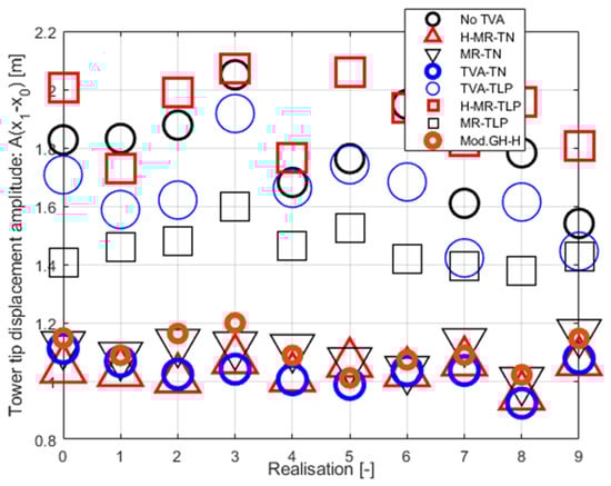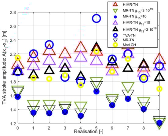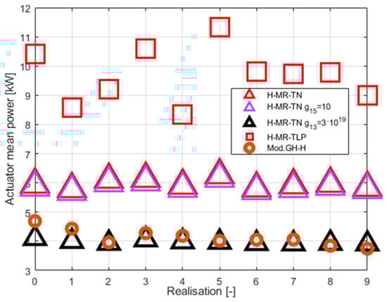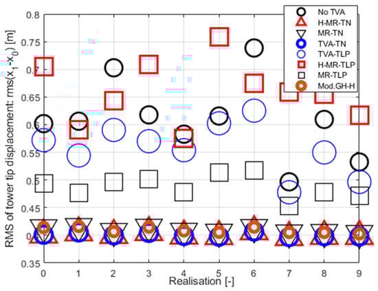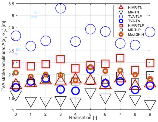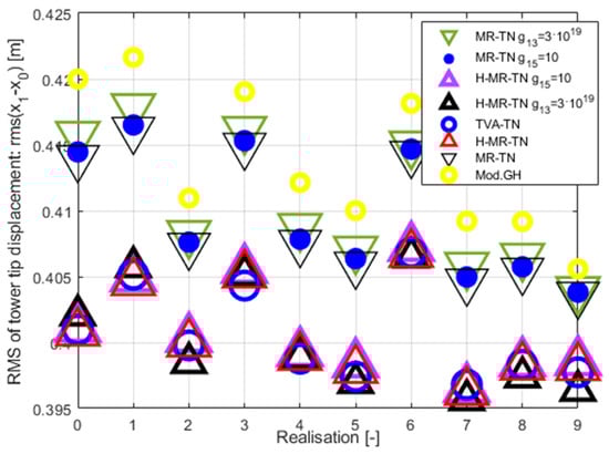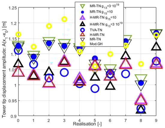 The efficiency of the considered solutions was analysed using the following quality indexes: tower tip relative displacement (i.e., tower deflection) root-mean-square (RMS) ) (Figure 7 and Figure 8), tower tip relative displacement (tower deflection) amplitude ) (Figure 9 and Figure 10), TVA stroke amplitude ) (Figure 11 and Figure 12), the MR damper force amplitude (Figure 13 and Figure 14; Mod.GH and Mod.GH-H results excluded due to seriously outlying values–see Table 5), and mean actuator power (Figure 15), along with the time patterns of , , , , and (Figure 16, Figure 17 and Figure 18) and Table 5 ( states for the amplitude, i.e., the maximum deviation from the equilibrium state). The ) (equal to the standard deviation for zero mean value) value indicates the tower structure operational fatigue, the tower deflection amplitude indicates the maximum structural stress, whereas the TVA stroke amplitude determines the spatial and structural applicability of the vibration control solution; the required MR damper force , associated with the particular solution, conditions its efficiency. In Table 5, the most favourable results are marked in green boldface, the worst results are marked in red boldface, whereas the runner-up solutions are marked in green/red (respectively) regular face.