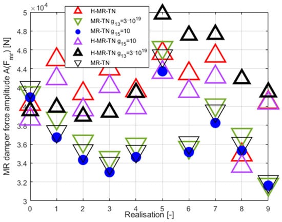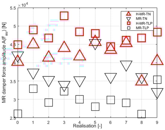 All the structural model parameters, as in Table 3, along with the MR damper model parameters (Table 4) were assumed for the simulations. The value of A yielding respective ranges and nominal actuator output force kN were tuned to the current application. As previously proven [21], the MR damper responds faster than the electromagnetic actuator. In contrast, the actuator may cancel the MR damper undesirable (i.e., of improper sign due to its dissipative nature) force. The resultant maximum MR damper force was ca. 50 kN (excluding the more demanding Mod.GH and Mod.GH-H solutions), whereas the mean actuator power was up to 6.27 kW for TVA-TN hybrid solutions; however, less force/power demanding solutions were investigated as well.
