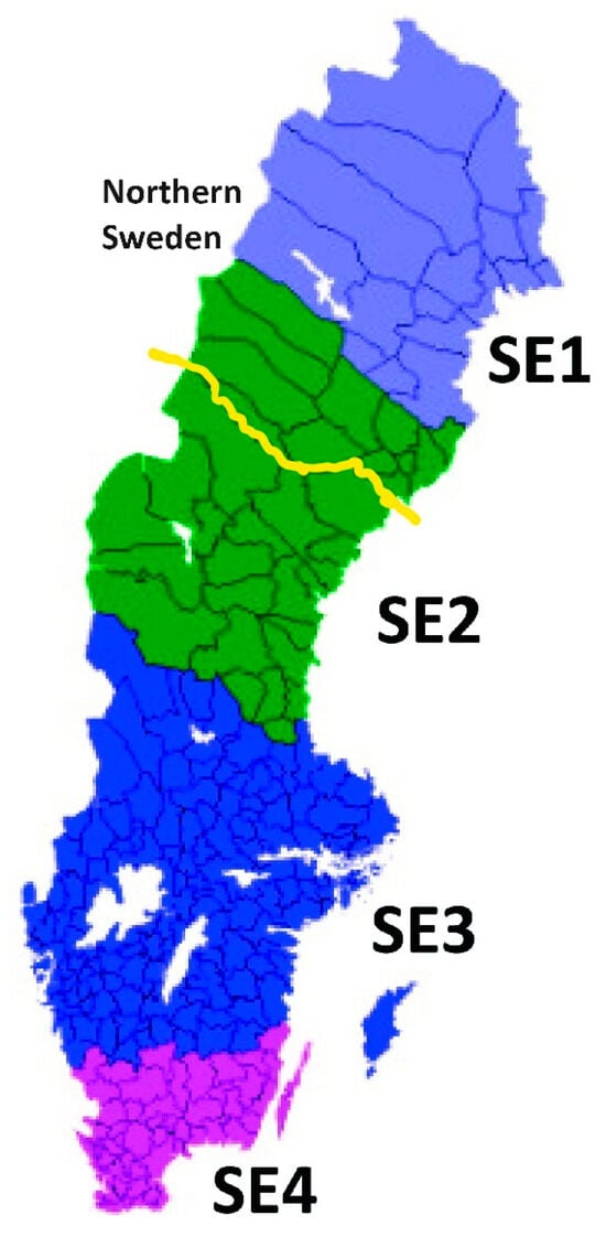 The Swedish transmission system is composed of a 400 kV grid and a 130 kV grid. The 400 kV grid is owned and operated by the system operator Svenska Kraftnät. The Swedish electricity market is separated into four bidding zones (SE1, SE2, SE3, and SE4), as shown in Figure 1 [3]. The border of Northern Sweden (Västerbotten and Norrbotten counties) is marked with a bold yellow line in the figure. Västerbotten and Norrbotten counties are within the Bottenviken water district of Sweden. Electricity in Northern Sweden is mainly generated by hydropower stations along the rivers. There is a 400 kV transmission line along the Luleå river, and a number of 130 kV lines from the Luleå river southwards link the 400 kV grid with smaller hydropower stations and cities. The 130 kV grid in Northern Sweden is owned mainly by Vattenfall and Skellefteå Kraft.