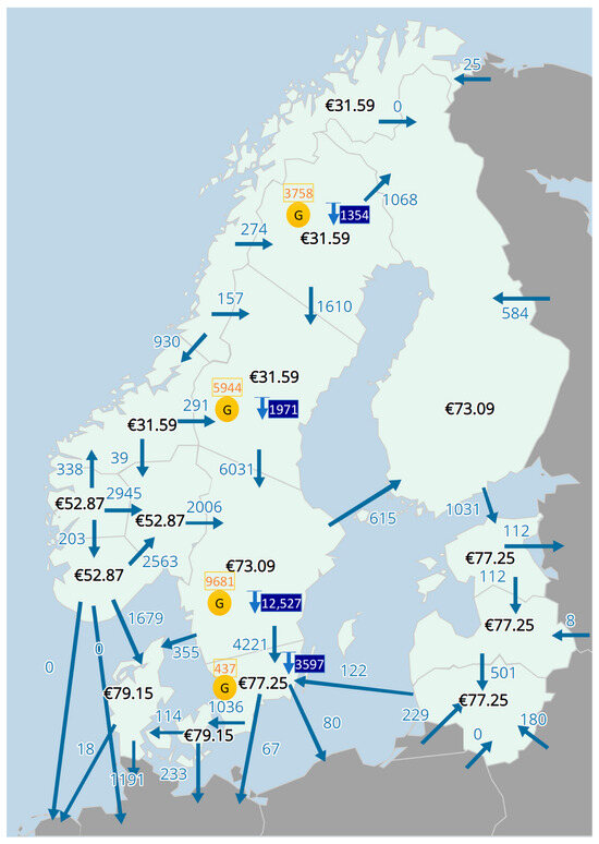 Generation, demand, and zonal prices for a snapshot of Swedish price zones.
