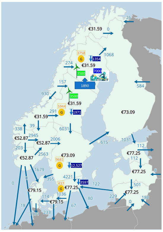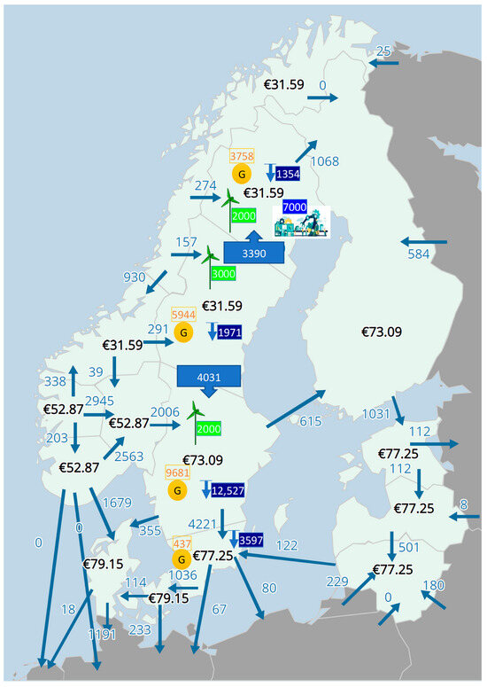 In Figure 4, an assumption is made that the electricity load of the steel industry is supplied by new wind power distributed in the whole country. New wind power in SE1, SE2, and SE3 will be 2000 MW, 3000 MW, and 2000 MW, respectively. This assumption has the benefit that SE3, as the conventional load center, will have some new generation resources, which will release the burden of a heavy power flow from the north to the south. The bottleneck between SE2 and SE3 could be released, and hence lower the electricity prices in SE3 and SE4. With this assumption, it is calculated that the power flow between SE2 and SE1 is around 3390 MW. If this amount is higher than the capability of the transmission corridor, more wind power could be installed in SE1 or use stored hydrogen. The power flow between SE2 and SE3 will be around 4031 MW, which is significantly reduced compared to the current situation, and the bottleneck is released.