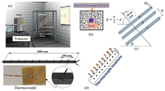 Experimental setup: (a) schematic of the experimental test rig, (b) cross-section of the cylinder showing the sand and the inside heater, (c) sequential order of the cylinder in the array 1, 2, and 3, and (d) thermocouple locations, sequential order, and shape.