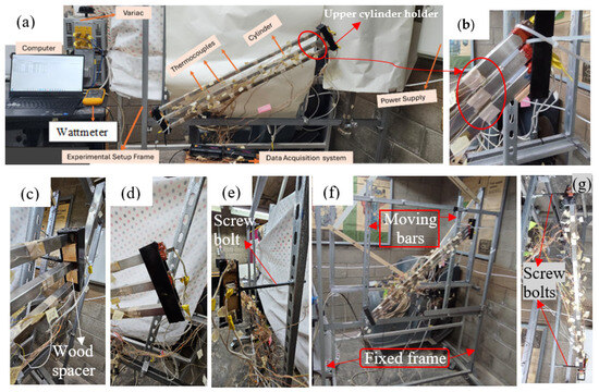 Real photo of the experimental setup: (a) all components, (b) close-up section of the thermocouples, (c) left side view of the cylinder holder, (d) front view, (e) right view, (f) fixed and moving frames of the setup, and (g) top view of the array showing the screw bolts.
