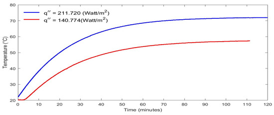 The variables and in Equation (3) correspond to the temperatures recorded at the inner and outer surfaces of the Bakelite end plates, respectively. The characters kbk and δ represent the thermal conductivity and thickness of Bakelite, respectively. The calculation of the radiative heat flux, represented as , involves calculating the average surface temperature of each heat flux on the cylinder, and T∞ is the absolute surrounding temperature. Moreover, the surface emissivity (ε) of the cylinder is approximated to be 0.27 [19] for polished mild steel. Furthermore, stand for the Stefan–Boltzmann constant and the shape factor between each tube and the ambient, and γ = 1 for the lower and the upper cylinders and 2 for the middle cylinder. Equation (4) presents the shape factor between two long parallel tubes [19]. As suggested by [1], it assumes that neighboring tubes are in radiant balance since the radiation exchange between similar cylinders is small and will be neglected and the net exchange is considered with the room walls. The estimated amount of radiation heat transfer is obtained at most, 29% of the total heat flux. This study assesses the convection heat transfer coefficient for axial heat transfer, which is averaged over the circumference temperature. Equation (6) determines the circumference average surface temperature at a specific longitudinal station i along the cylinder axis at each heat flux.