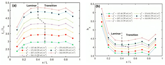The temperature readings are taken after the system of the inclined array reaches a steady state. Therefore, Figure 3 shows the steady-state temperature condition at two different heat fluxes. It seems that the system takes about 100 min to reach the steady state condition. Figure 4a,b shows the circumference averaged temperature and heat transfer coefficient profiles, respectively, at different heat fluxes of cylinder number 1 (upper cylinder) in the array at a 60° angle of inclination. It should be noted that the axial temperature is normalized by the ambient temperature, which appears in the vertical axis of Figure 4a. Figure 4a indicates that the temperature increases up to a maximum value (dashed line) and then slightly decreases due to the end effects. The temperature is almost uniform between the dimensionless axial coordinate (0.2 ≤ x/L ≤ 0.7). The local heat transfer coefficient shown in Figure 4b decreases up to a minimum critical point (dashed line) and then slightly increases. The region on the left of the dashed line presents a laminar regime and the region on the right presents the transition regime, as is discussed in detail later. Table 2 shows the modified Rayleigh numbers, heat flux by convection, and radiation at these critical points shown in Figure 4a,b. Figure 5a,b show the local axial circumference averaged Nusselt numbers Nux for the single square cylinder versus the axial modified Rayleigh numbers . In this figure, each profile presents a single cylinder when it existed alone (not in the array of cylinders) at a specified tilt angle of 30°, 45°, or 60°. Figure 5a shows the experimental data point at each angle with the curve fitting at each angle and Figure 5b shows the curve fitting at each angle without the experimental data points for clarity. The curve fitting correlation for the single cylinder at each angle is obtained and listed in Table 3. Table 3 shows also the overall correlation using the cylinder axis tilt angle as a parameter. It should be noted that these correlations will be taken as references for comparisons with the same cylinder when it exists in the array to clarify the degradation in Nux due to the other cylinders, which will be spaced according to different S/D ratios. This figure indicates that increasing the tilted angle degrades the Nusselt numbers, especially at high Rayleigh numbers. Table 3 shows this degradation at = 4 × 1011 from that at 30°. Figure 6 shows the percentage difference between the predicted overall correlation (4) of the single cylinder at all angles and the experimental data. This figure indicates that the difference is in the range of ±10% to the ideal fit.