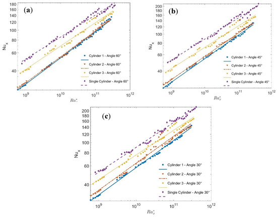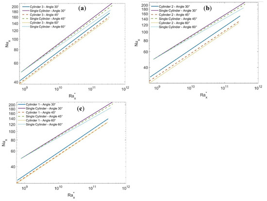Nusselt numbers versus the modified Rayleigh numbers at different tilt angles for S/D = 1.25 compared to that of a single cylinder: (a) cylinder number 1, (b) cylinder number 2, and (c) cylinder number 3.