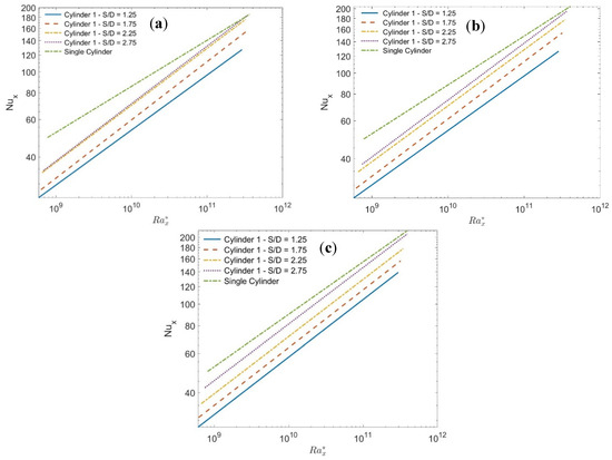 The physical interpretation of that is related to the competition between the thermal boundary layer (TBL) accumulated at each cylinder and the natural convection velocity (NCV) created by the rising plume. The first tends to degrade the heat transfer from that cylinder and the latter tends to enhance it. For cylinder number 3, which is subject to the double effect of TBL, one is from its upper surface and the other is from the lower surface of the middle cylinder (in the case of a small S/D ratio) in addition to the TBL from its lower surface. The effect of these two competing components depends on the S/D ratio at each angle, which tends to lower the degradation effect as the S/D increases. Based on that, the profiles of Nux for cylinder 3 are closer to its single (Figure 7c), followed by cylinder number 2 (Figure 7b), and number 1 (Figure 7a).