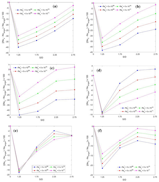 Percentage degradation in Nux compared to the single cylinder (S/D = 0): (a) Cy #1 at 30°, (b) Cy #1 at 45°, (c) Cy #1 at 60°, (d) Cy #3 at 30°, (e) Cy #3 at 45°, and (f) Cy #3 at 60°.