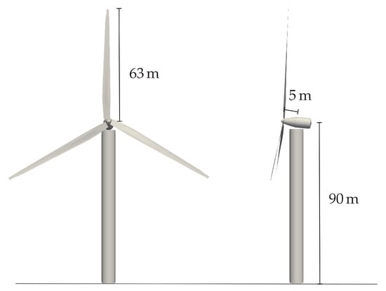 The first test case considered is the NREL-5 offshore wind turbine. It is a three-bladed horizontal axis utility scale turbine with a rotor diameter D = 126 developed by Jonkman et al. [18]. This is a widely used test case for aerodynamics and aeroelasticity research as all details of the turbine geometry and of the operating conditions are public, which is not the case for large-scale commercial turbines. The NREL-5 machine is a purely theoretical wind turbine and therefore no experimental data is available to validate simulations. However, the extensive simulations conducted on this test case lend substantial credibility to its applicability for this study. A summary of the turbine’s essential features is presented in Table 1 and illustrated in Figure 1.