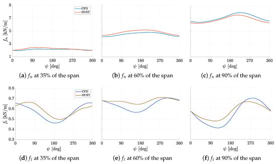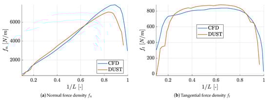 Figure 6 shows the comparison of the normal and tangential sectional forces acting along the normalised spanwise coordinate of the blade computed by the DUST NL-VL model and high-fidelity CFD simulation by Dose et al. [26]. The normal force density comparison illustrated in Figure 6a exhibits a close alignment between DUST and high-fidelity CFD data along almost the majority of the blade span. However, near the blade tip, DUST slightly underestimated the normal force. This behaviour is expected as wing tips are characterized by a more complex flow regime where three-dimensional phenomena and tip vortices generation typically leads to significant viscous effects and separated flow regions, which cannot be accurately captured by the DUST mid-fidelity approach. Tangential force density comparison depicted in Figure 6b shows an underestimation of DUST computation before the first 30% of blade span and a slight overestimation in the central spanwise region. The high-fidelity CFD model, however, shows a more pronounced decrease in tangential force towards the blade tip with respect to the DUST results. Generally speaking, the behaviour of the sectional force comparison confirms the capability of DUST to competently reproduce the general force distribution along the blade span.