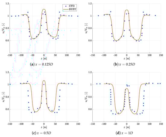 The performance of a wind turbine is significantly affected by the wind turbine wake. Therefore, a crucial step for DUST validation is the ability to correctly capture the wake development and its main features in terms of velocity field. Then, the deficit of the axial velocity in the wake calculated by DUST is compared with the high-fidelity simulation by [42], considering four streamwise positions located at different distances x downstream from the rotor plane. The comparison of velocity profiles is shown in Figure 7 as function of z, representing the distance from the shaft axis parallel to the rotor plane.