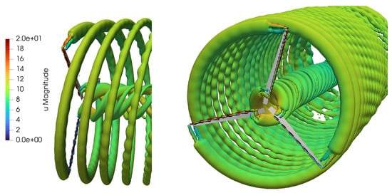 A reasonably good agreement was found between axial velocity profiles in the wake of the wind turbine, particularly near to the rotor disk, i.e., and . Some discrepancies were found at higher distances where CFD results show a slightly larger extension of the wake, probably due to numerical diffusion. Generally, Figure 8 illustrates the wake structure computed by DUST shown as an iso-surface of the vortex Q-criterion. Readers are referred to results reported in [42] to appreciate the capability of DUST to capture the behaviour of the wake structure computed by CFD.