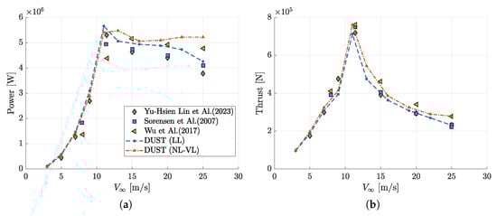 Comparison of integral rotor power (a) and thrust (b) computed by DUST and high-fidelity CFD by Sørensen and Johansen [20], Lin et al. [21], Wu and Nguyen [22] as function of inflow wind speeds for the NREL-5 wind turbine in C4 configuration.