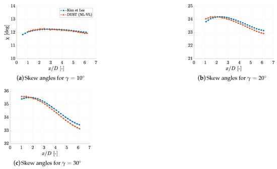Another important feature to better understand the capability to capture the wind turbine wake behaviour for yawed configuration is the study of the evolution of the wake center-lines and the associated skew angles. The wake center-lines are imaginary lines that run through the middle of the wake, marking the trajectory of the region with the highest velocity deficit caused by the wind turbine and representing the path that the wake follows downstream of the turbine. This line can be calculated as the integral of the velocity deficit on a wake section perpendicular to the flow direction divided by the area of that section [43]. This method gives an average value that accounts for the different velocities across the entire wake area, providing a singular measure of the wake’s strength. The skew angles, instead, give a more quantitative analysis of the wake center trajectories. Skew angle is the angular measure between the position vector extending from the rotor disk midpoint and the normal vector to the rotor disc, as shown in Figure 11 and defined in Equation (1). Figure 12 shows the skew angles behaviour calculated by DUST compared with LES results by Kim and Lee [25], for yawed conditions ranging from to . The comparison shows how DUST is capable to correctly evaluate the wake center line evolution and the corresponding skew angles that change with respect to yaw angle and show a peak around .