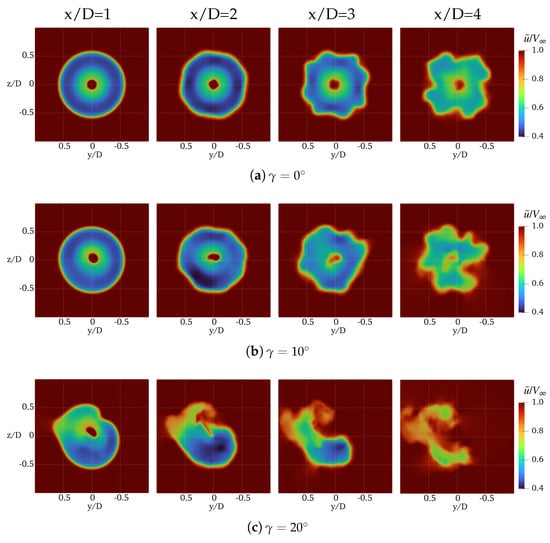 Contours of the averaged streamwise velocity, , computed by DUST (NL-VL) on transversal planes for the NREL-5 wind turbine at with different yaw angles.