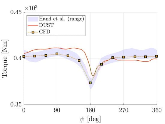 Comparison of the time history of the single blade aerodynamic torque over a full revolution compared with high-fidelity results from [33] and experimental results from [1] at . The standard deviation of the experimental load is reported as a banded region.