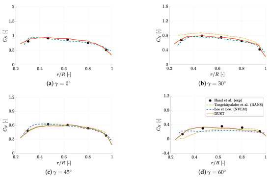 Now, the attention is focused on the evaluation of loads for yawed conditions. Thus, blade sectional normal and tangential force are compared in Figure 18 and Figure 19, respectively, for different yaw angles. In particular, DUST results are compared with NREL measurements [1] and with numerical results obtained by RANS simulations [44] and by a non-linear vortex lattice method (NVLM) described in [45].