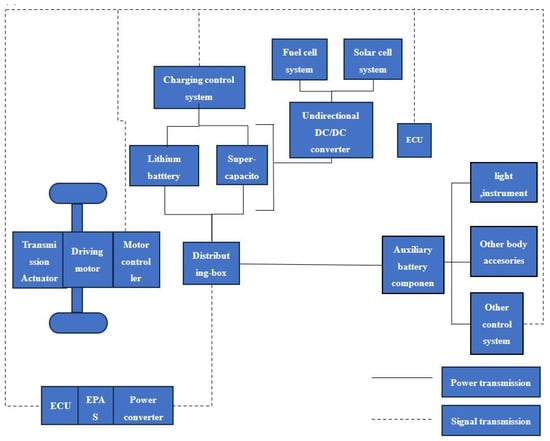 The designed test vehicle is a rear-wheel-drive vehicle equipped with high and low gear transmission ratios but lacks a braking energy recovery system. The driving strategy “FC + B + SC” entails using two solar panels to charge the lithium battery. In this setup, the lithium battery directly powers the motor, while the supercapacitor supplements energy during climbing, acceleration, and start–stop scenarios. Moreover, the fuel cell and solar panel collaboratively charge the lithium battery during operation. The supercapacitor and lithium battery operate in parallel and are linked to the drive motor. The electrical system schematic of the experimental vehicle is shown in Figure 1 and the designed vehicle is shown in Figure 2. The details of this hybrid powertrain design are as follows: