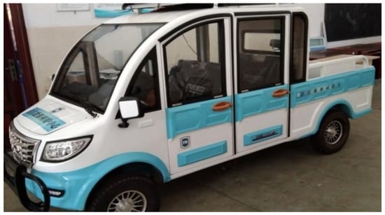 The test vehicle underwent modification from a low-power electric vehicle, retaining its original body structure and driving motor. The alterations to its internal battery circuit included the integration of lithium batteries, as well as the incorporation of solar panels, fuel cells, and other relevant components. Following the modifications, the test vehicle achieved a maximum speed of 35.5 km/h. The vehicle’s acceleration performance was measured with a static start to 20 km/h in 6.4 s and to 30 km/h in 11.79 s. A comprehensive view of the entire vehicle can be observed in Figure 2, while the primary parameters of the vehicle body are detailed in Table 1.